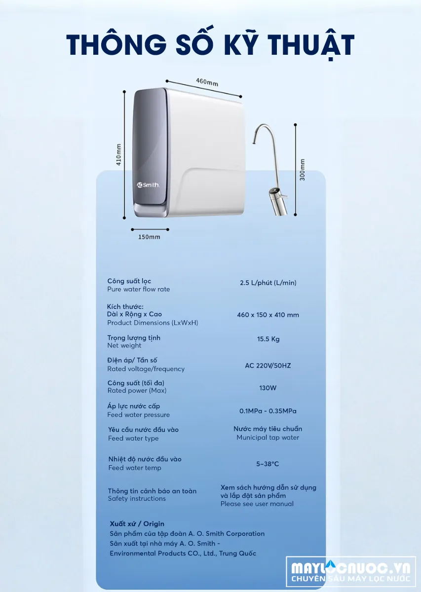 Sản phẩm của tập đoàn A. O. Smith Corporation; sản xuất tại nhà máy A. O. Smith - Environmental Products CO., Ltd., Trung Quốc