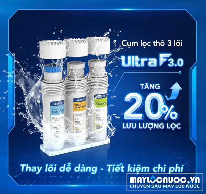Ultra F3.0 gồm 3 lõi tích hợp, bao gồm PP 5 micron, than hoạt tính và PP 1 micron