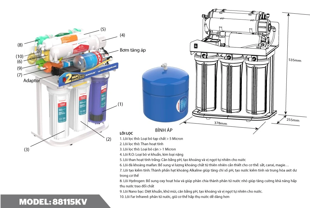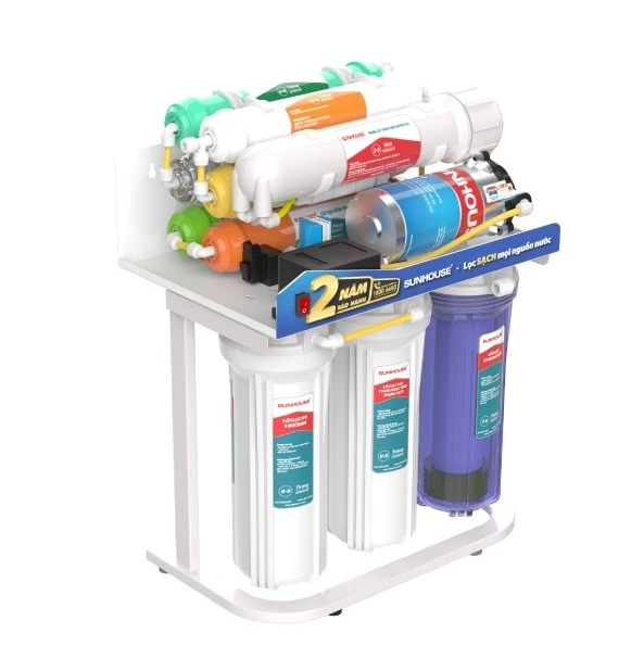 Máy lọc nước R.O không vỏ SUNHOUSE 10 lõi SHA88115KV là lựa chọn phù hợp cho gia đình cần thiết bị lọc nước gọn, dễ lắp đặt và hiệu quả cao. Sản phẩm sử dụng màng lọc R.O nhập khẩu Hàn Quốc, kết hợp bộ 10 lõi lọc giúp loại bỏ đến 99.99% tạp chất, vi khuẩn, kim loại nặng, rỉ sét, Clo và đồng thời bổ sung khoáng chất có lợi cho sức khỏe.