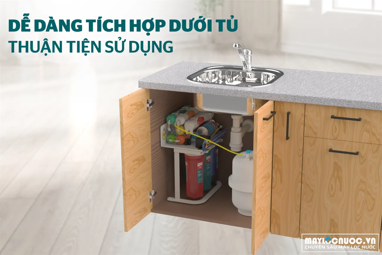 Thiết kế nhỏ gọn, dễ lắp đặt dưới tủ bếp, phù hợp nhiều không gian nội thất. Kích thước máy: 365 x 250 x 515 mm.