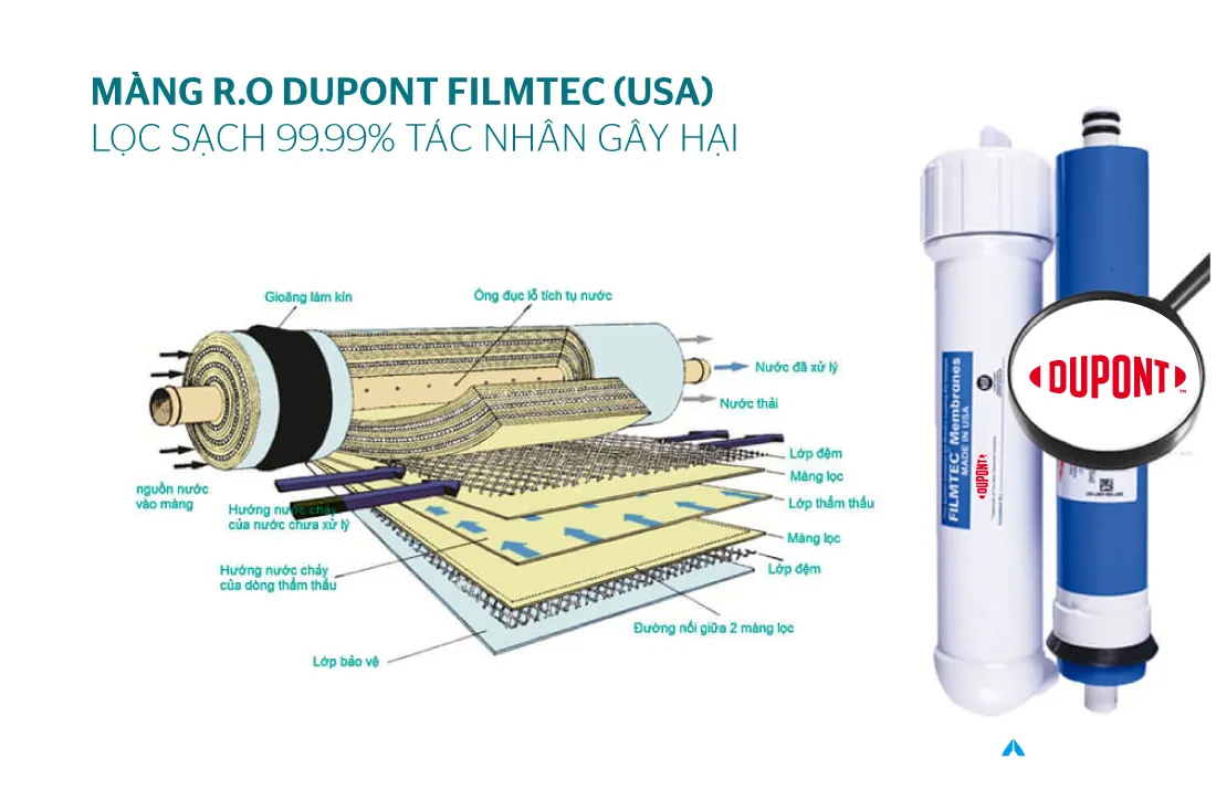 Hệ thống lọc 10 lõi gồm 3 cấp lọc chính: lọc thô, lọc tinh và bù khoáng. Trong đó, các lõi lọc thô giúp giữ lại cặn bẩn, bảo vệ màng R.O; màng R.O DuPont Filmtec hỗ trợ lọc sạch đến 99,99% tạp chất gây hại.
