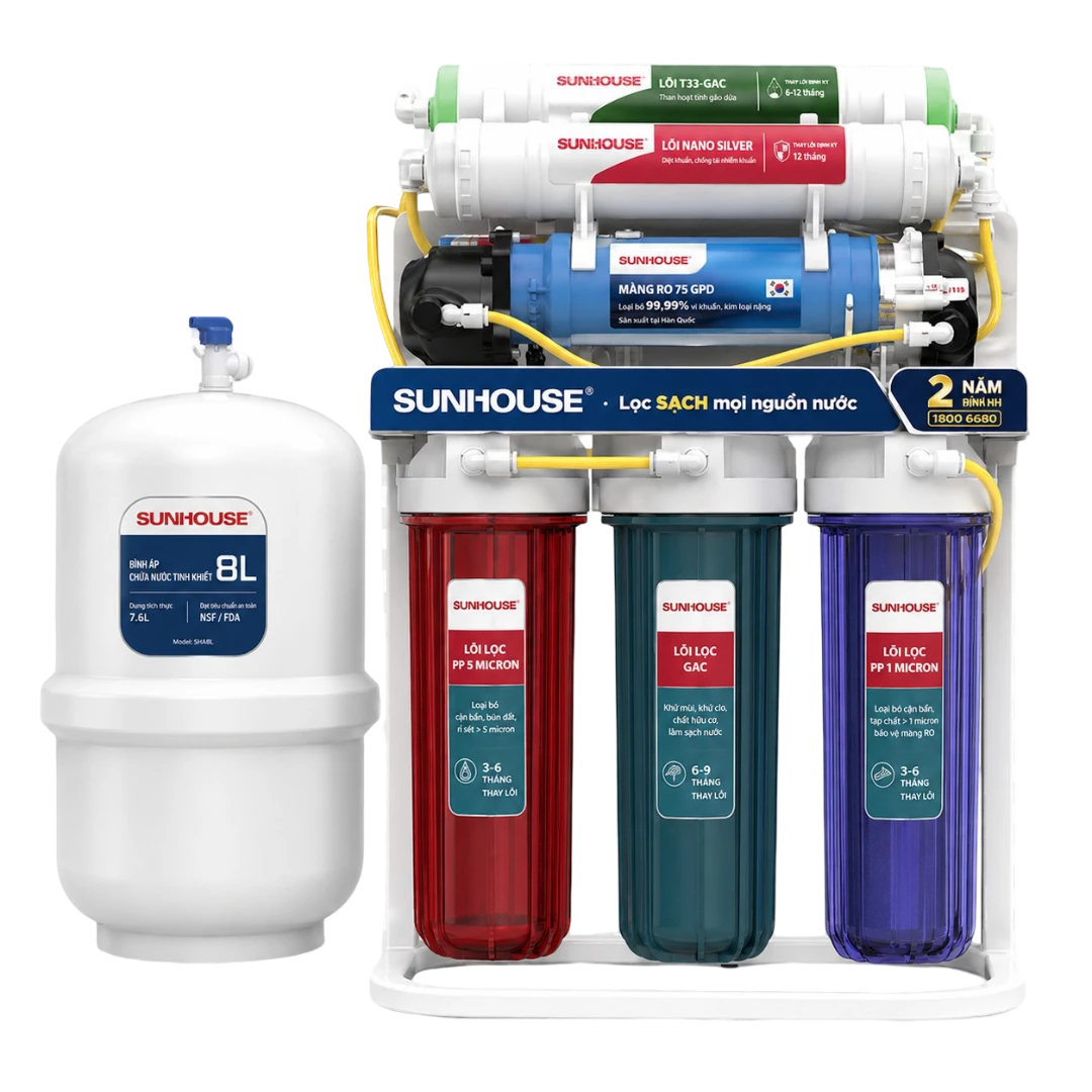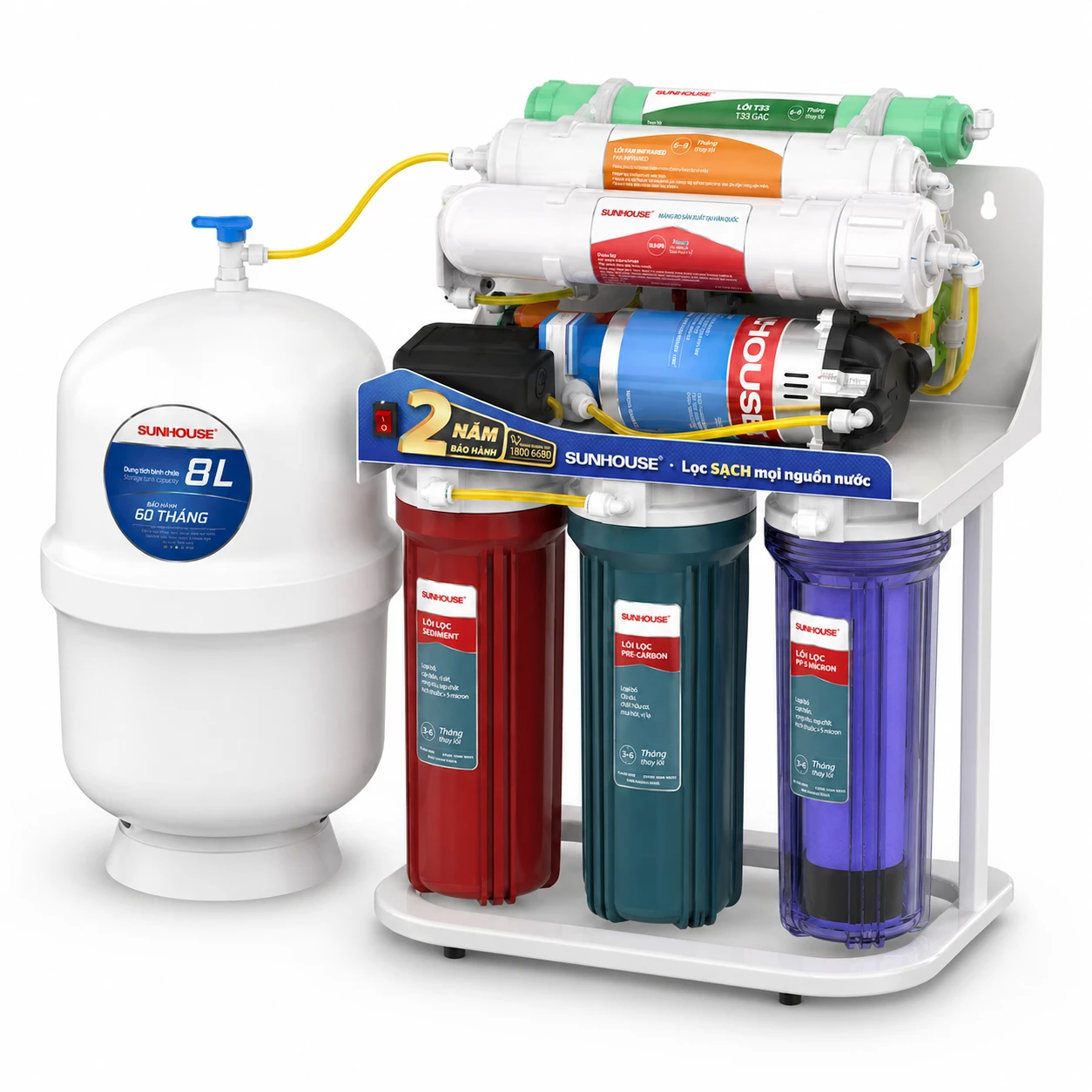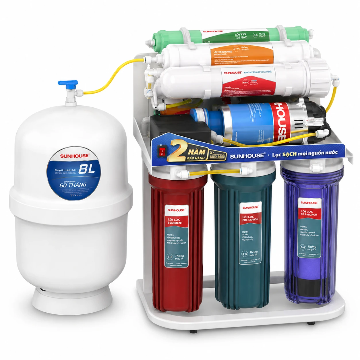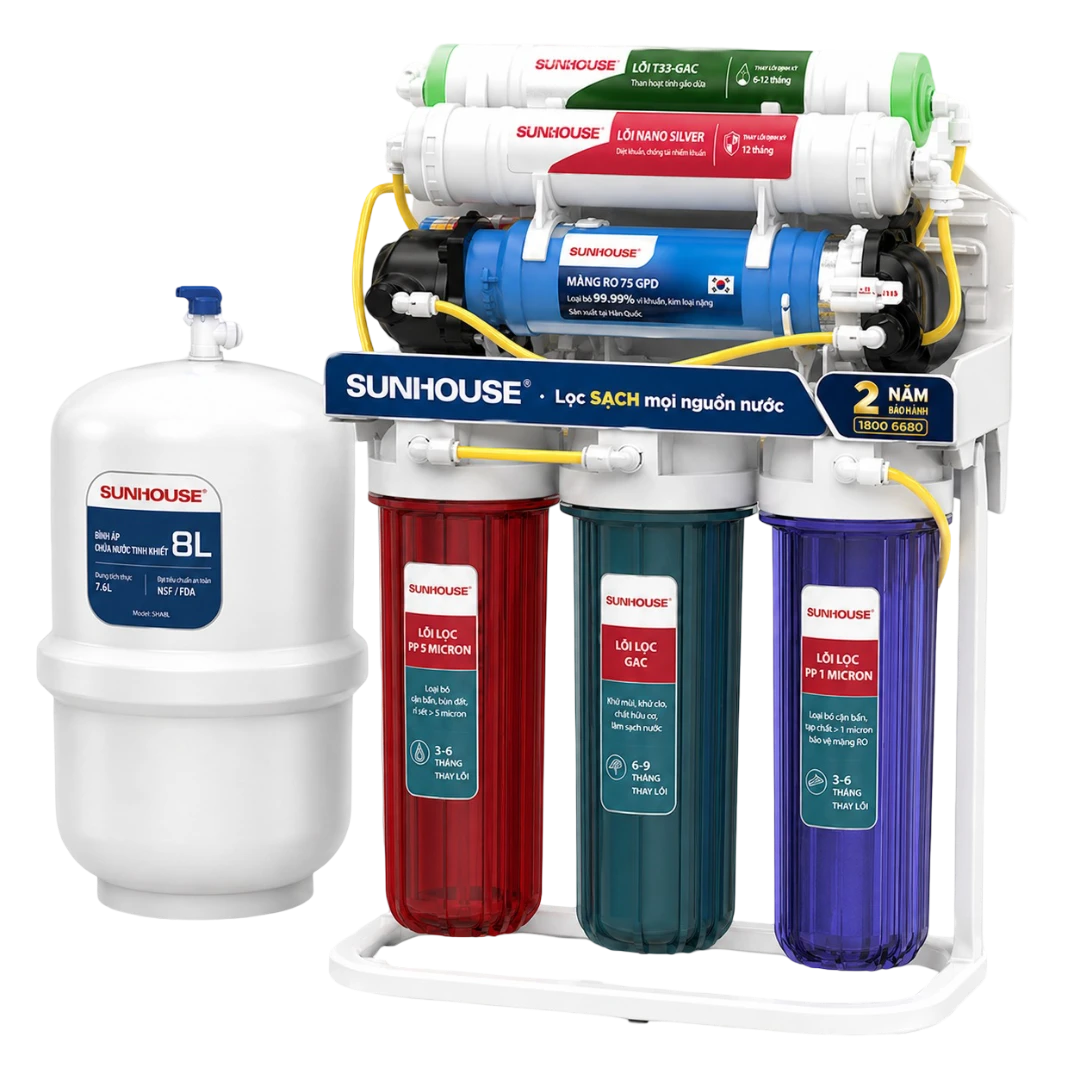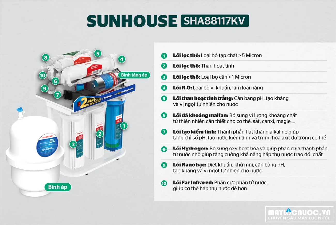 Máy lọc nước R.O không vỏ SUNHOUSE 10 lõi SHA88117KV là lựa chọn phù hợp cho gia đình cần nguồn nước sạch, an toàn và tiết kiệm diện tích. Sản phẩm sử dụng màng lọc R.O DuPont Filmtec (USA) kết hợp bộ 10 lõi lọc giúp loại bỏ tạp chất, kim loại nặng, vi khuẩn, mùi lạ và bổ sung khoáng chất có lợi cho sức khỏe.